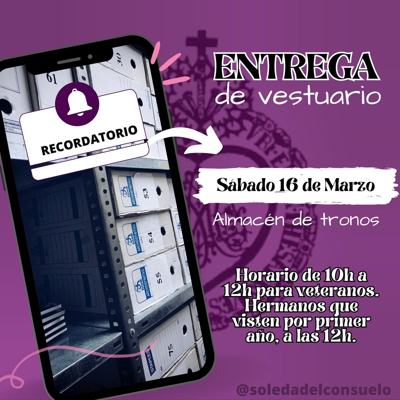 El próximo sábado tendrá lugar en los almacenes de la cofradía, la entrega de vestuario de la agrupación en horario de 10h a 12h. Recordad que hay que hacer el ingreso antes de la recogida, siendo 15€ la cuota de los alumbrantes (5€ si el alumbrante es menor de edad), y 35€ la de los portapasos. Debéis poner en el concepto el nombre del hermano, y llevar el recibo para la recogida del vestuario. A los suplentes, desde secretaría se os ha asignado un número a cada uno por orden de antigüedad, no hace falta que vayáis a la recogida, si hubiese que vestiros se pondría en contacto con vosotros el guardalmacén. Además, tendremos instalada nuestra mesa de abalorios. ¡Allí nos vemos! 💜🖤