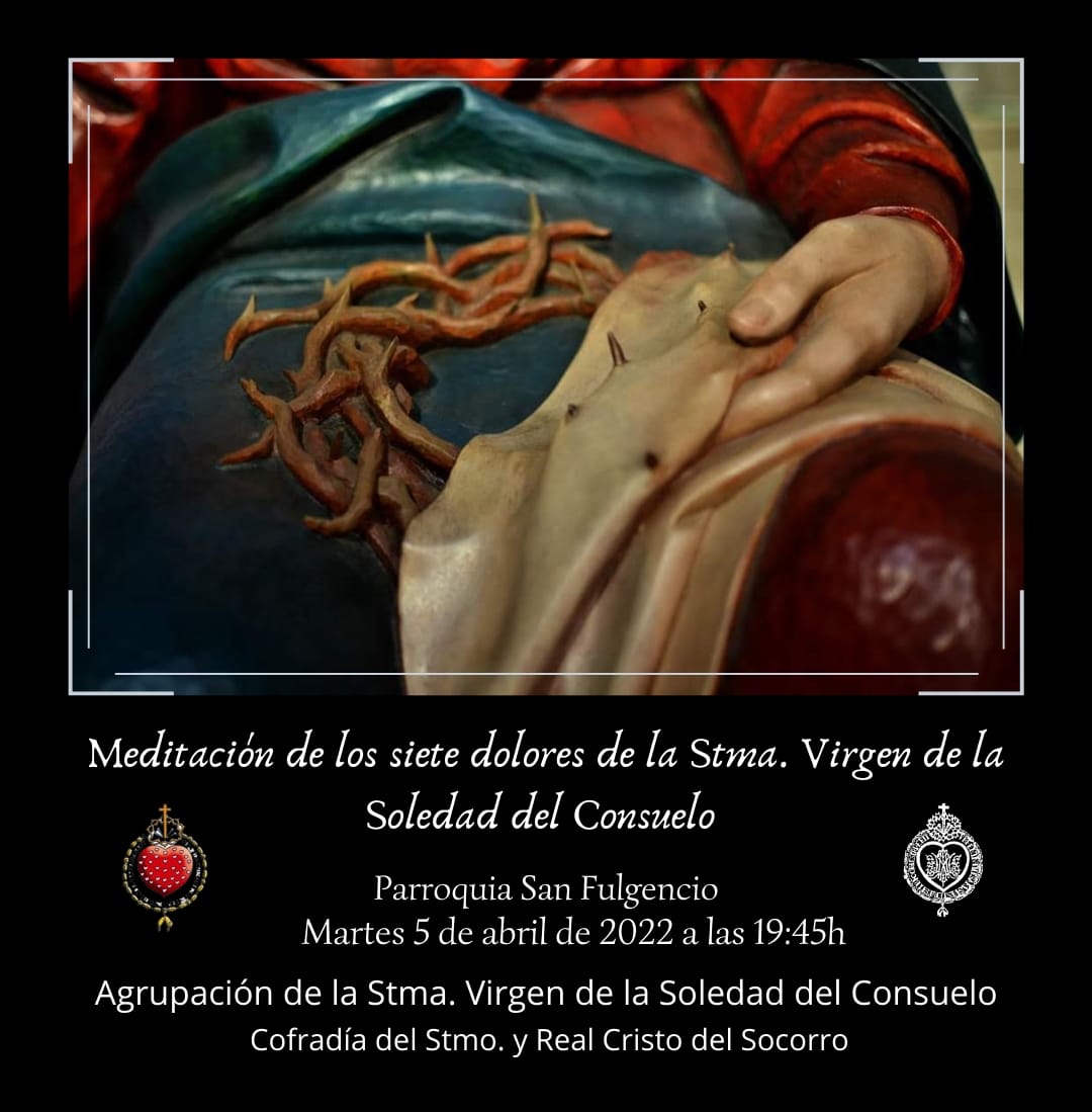 El próximo martes día 5 de abril a las 19:45h en la Parroquia San Fulgencio, y oficiado por nuestro Capellán D. Lázaro Gomáriz, Meditación de los Siete Dolores de la Stma. Virgen de la Soledad del Consuelo.