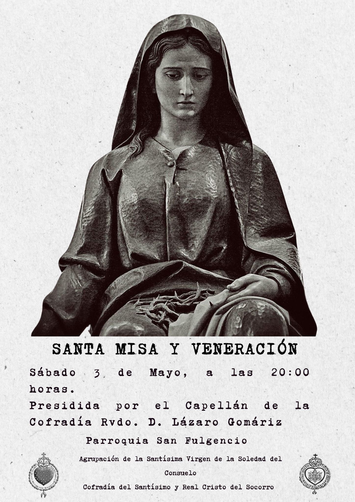 El próximo martes 8 de abril, ya a las puertas de nuestra ansiada madrugada de Viernes de Dolores, tendrá lugar el acto litúrgico de los Siete Dolores de la Stma. Virgen de la Soledad del Consuelo. Será a las 20:45h en la Parroquia San Fulgencio. Recordamos que podéis llevar objetos pequeños para bendecir frente a la Santísima Virgen. Os esperamos.